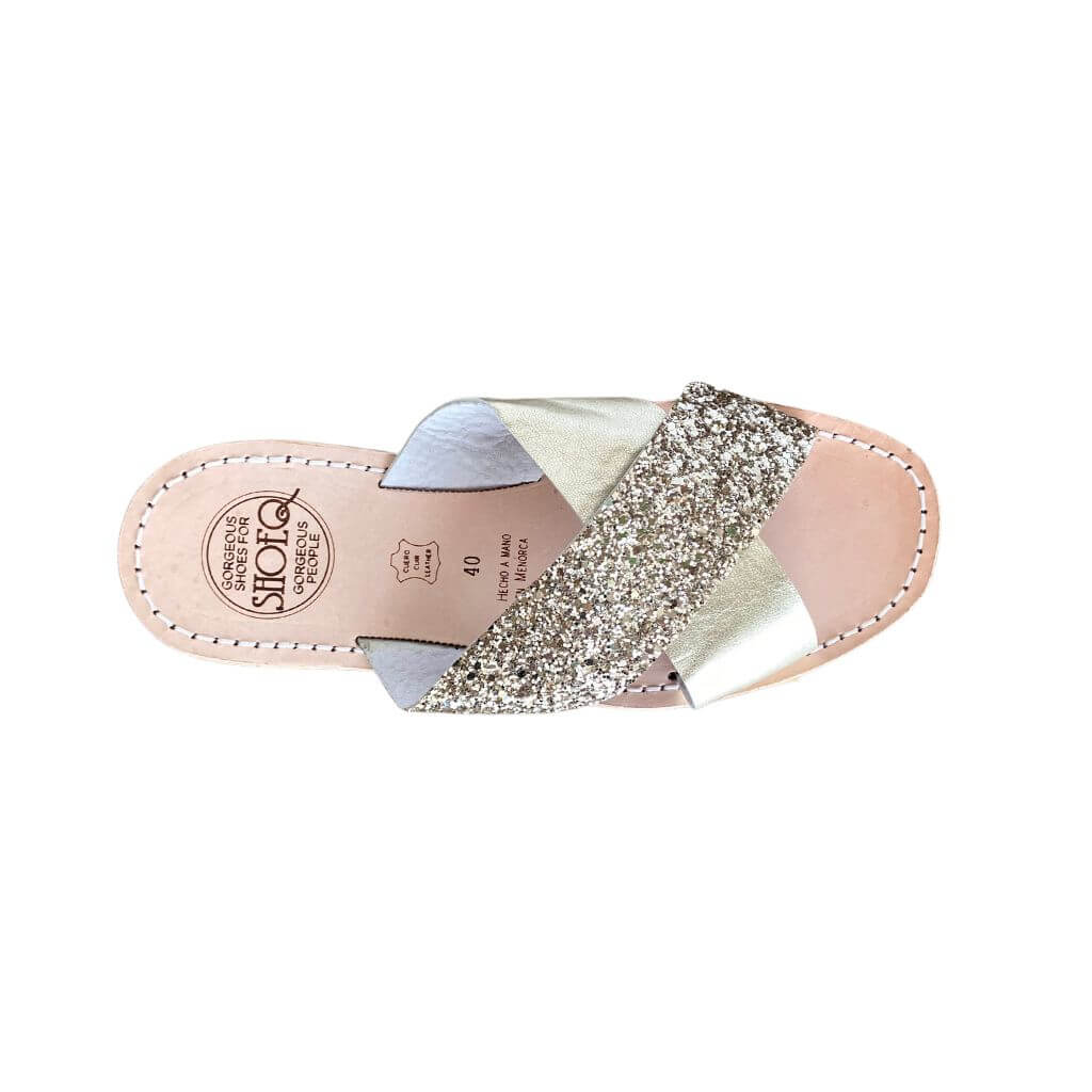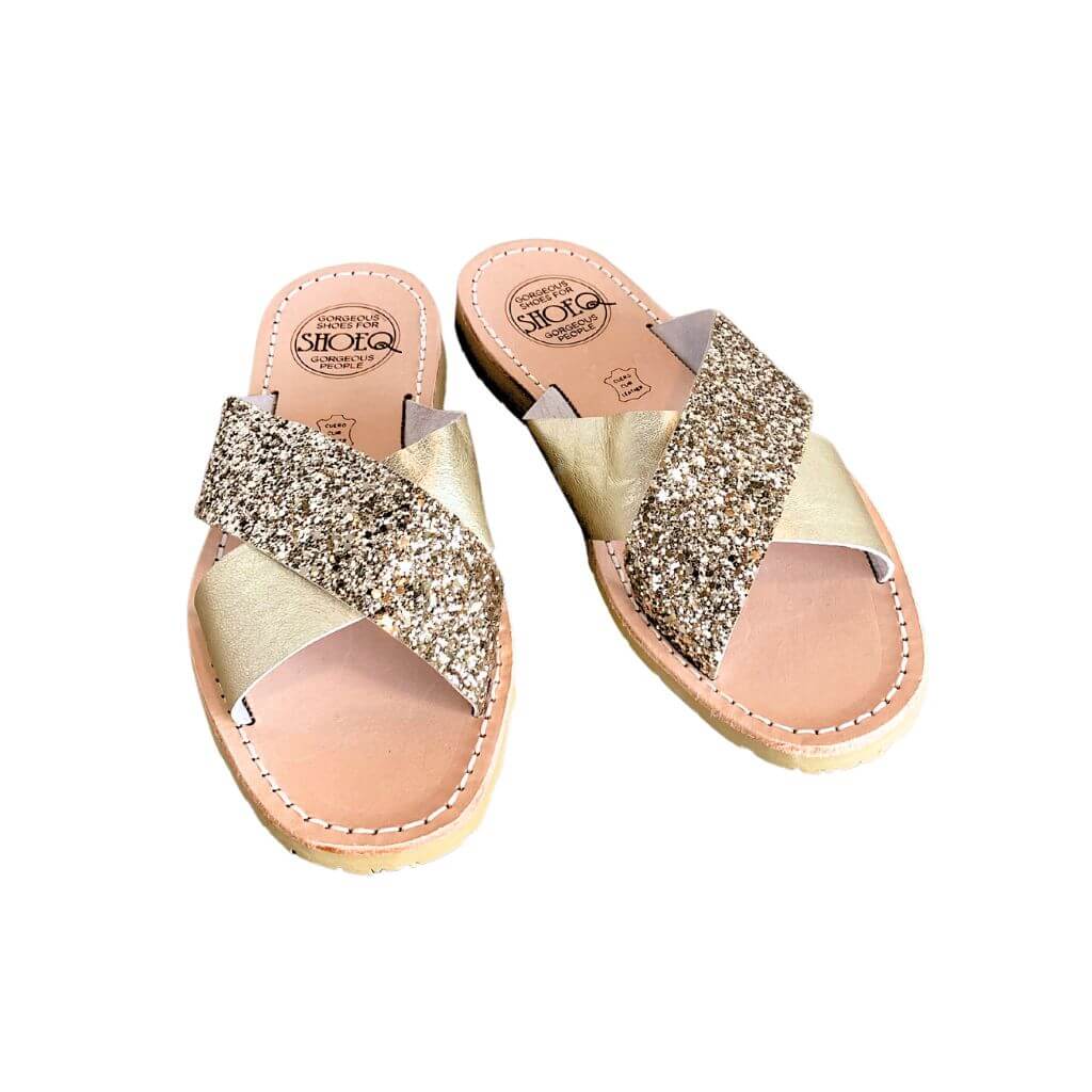 Mules croisées couleur champagne pailleté